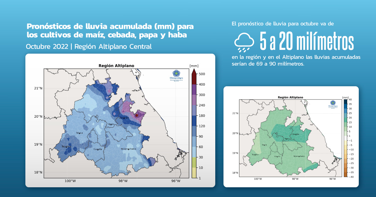 Considerando que el ciclo agrícola primavera-verano de 2022 ya está llegando a su etapa final, hemos seleccionado la región del Altiplano Central para ilustrar la interpretación y aplicación de los pronósticos mensuales de lluvia y de temperatura mínima en los cultivos básicos sembrados en esa región.