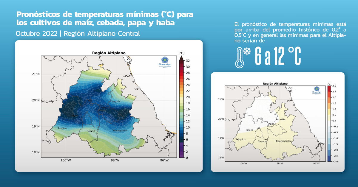 Las condiciones de temperatura mínima se esperan ligeramente por arriba del promedio histórico, con valores de 0.2 a 0.5 °C en las zonas agrícolas del Altiplano de Puebla y de Tlaxcala. En las zonas agrícolas del Altiplano de Hidalgo y norte del Estado de México se esperan valores cercanos al promedio. En general, el pronóstico indica temperatura mínima de 6 a 12 °C en la mayor parte de la región del Altiplano Central.
